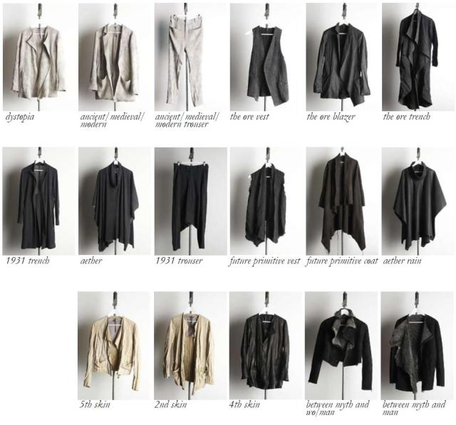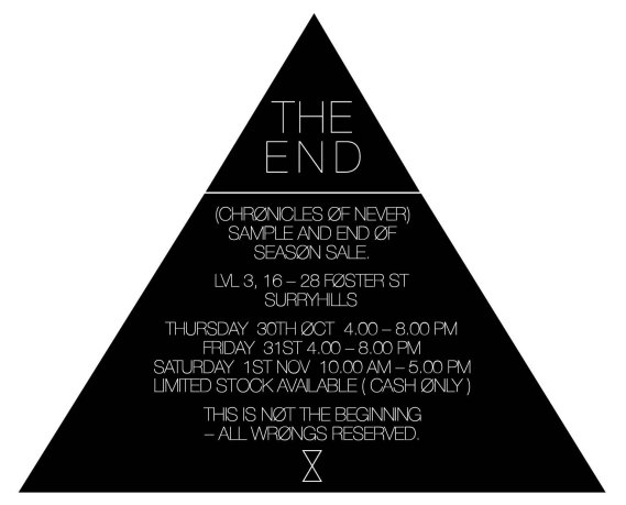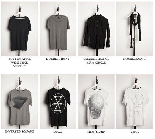 Sombre, calme, unisexe, aux formes géométriques, elle joue avec le temps et l’espace, logo de l’infini version triangle, inscrivant un nom sur chaque objet, le vêtement devient plus unique et intrigant. Chronicles of Never crée des tee-shirts oversized savamment déchirés ou en mailles fines. Les débardeurs deviennent hors de prix, des matières étranges composent les jeans très slim, parfaitement coupés. Les manteaux en cuir froissés sont cousus asymétriquement et se transforment en capes pour enterrement chic…